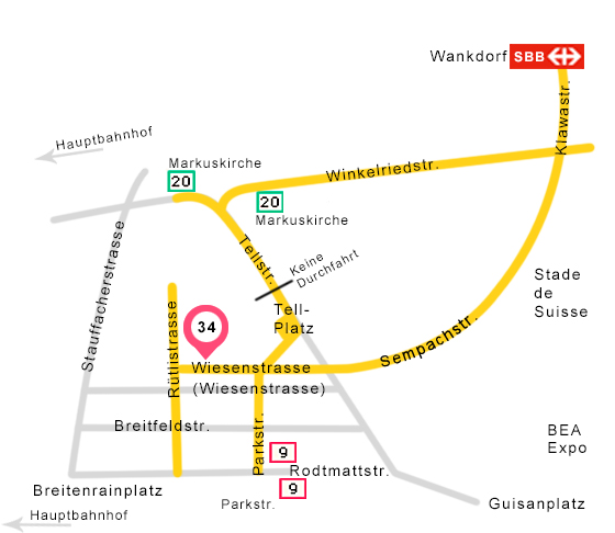 • Autobahnausfahrt “Wankdorf”, via BEA Expo – Guisanplatz fahren, an der Tellstrasse oder Parkstrasse parkieren